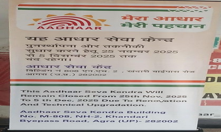 आगरा। खंदारी बाईपास रोड स्थित आधार सेवा केंद्र को तकनीकी सुधार और पुनर्स्थापना कार्यों के चलते 10 दिनों के लिए अस्थायी रूप से बंद...